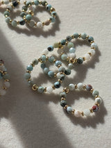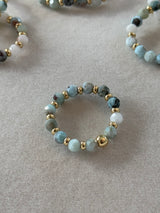 This Mini Bead Ring is made with 100% natural Larimar. Larimar is known for its soothing blue hues and healing properties. The stone is carefully selected for its unique color and natural patterns, offering a calming energy that promotes emotional healing and balance. The minimalist design features small, faceted beads of Larimar, making it a versatile accessory that can be worn on its own or stacked with other pieces. Perfect for those seeking both beauty and tranquility in their everyday jewelry collection.