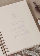 Thinking about the good parts of your day, the things you are grateful for and your truths. To get started, the first page prompts you to write your mantras, 5 things to quit, 5 things to remember (your truths, your core, the things that keep you centered) and your goals for the year. This page is a spot to look back on whenever you do not feel centered in your life, to guide you so you can remember your truths and the things that are important and to keep happiness in your life.